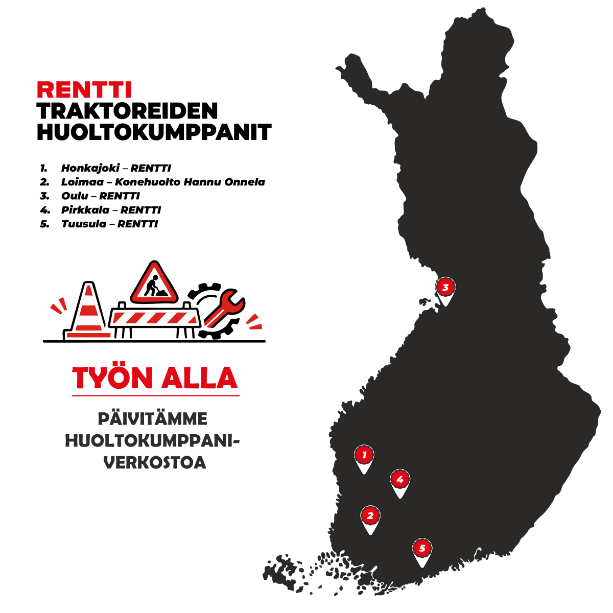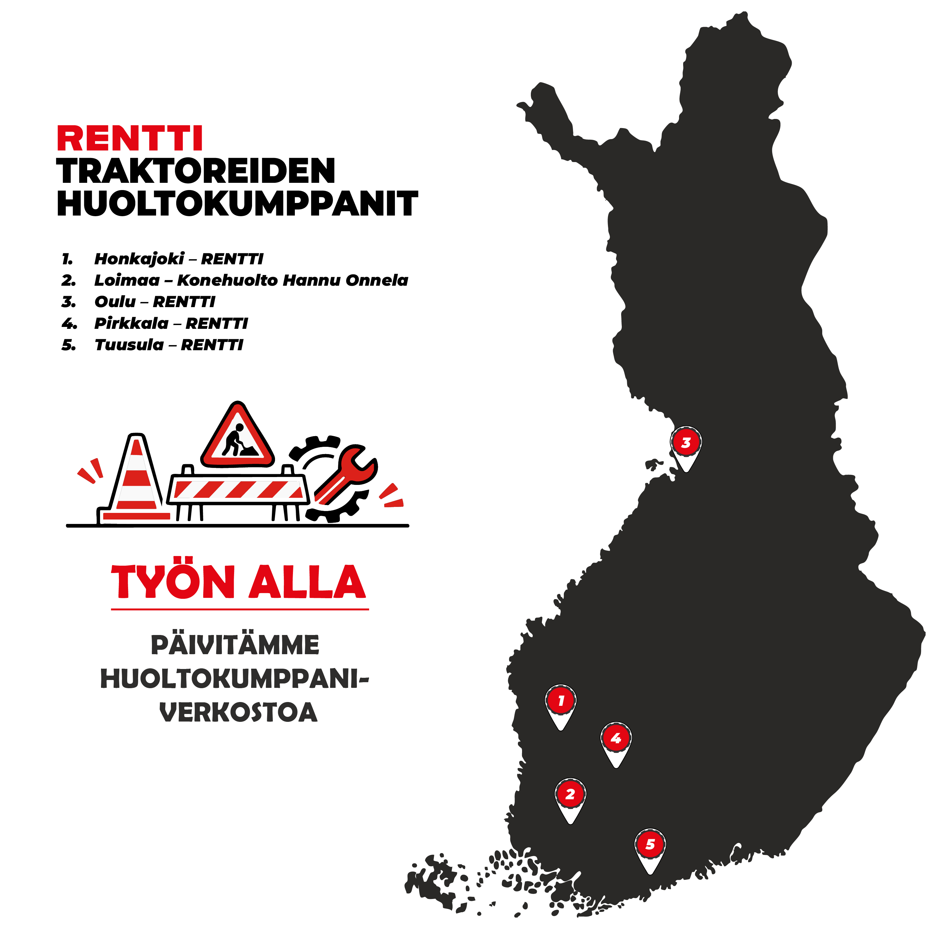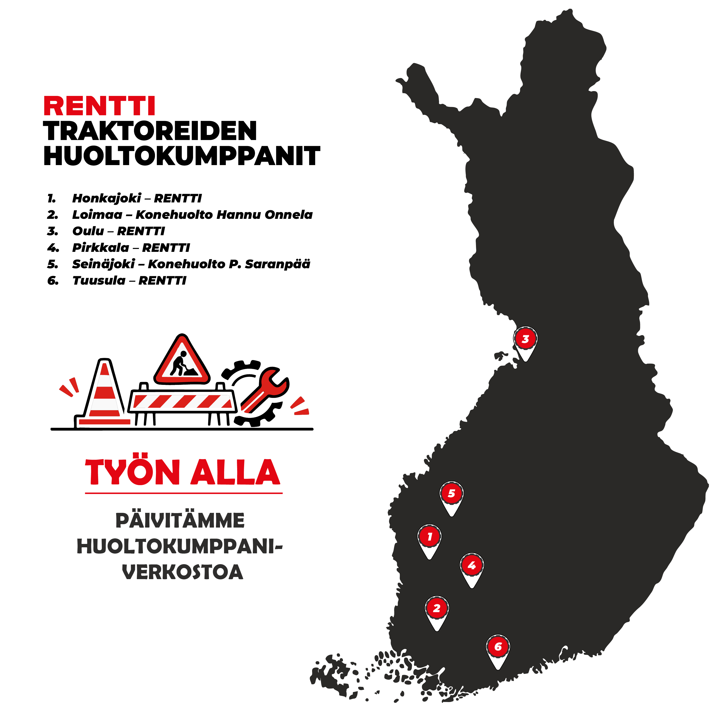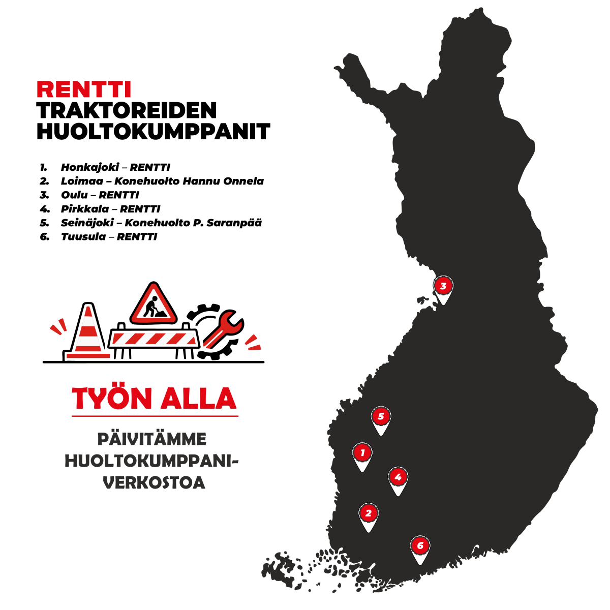 Rentin omat korjaamot palvelevat Tuusulassa, Pirkkalassa, Honkajoella ja Oulussa. Samoissa pisteissä toimivat myös varaosamyymälät, jolloin huollot saadaan tehtyä ripeästi ja yhdellä käynnillä.