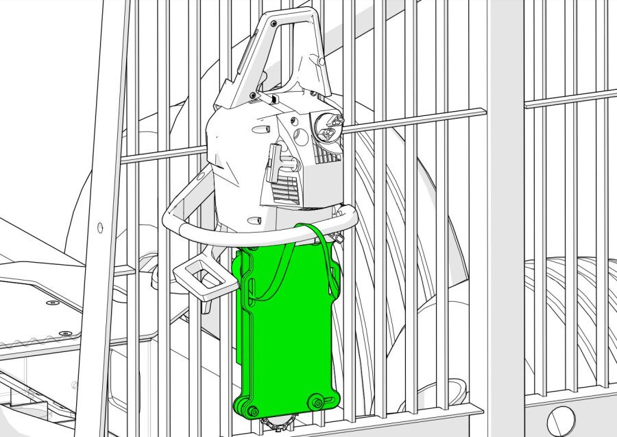 Pulttikiinnitteinen, säädettävä moottorisahapidike turvasäleikköihin. Se on säädettävissä sopimaan 70–110 mm leveille laipoille. Moottorisaha pysyy turvallisesti paikoillaan kahvan ympärille kiinnitettävän hihnan avulla, ja muoviset suojukset tukevat laippaa kuluttamatta ketjua.