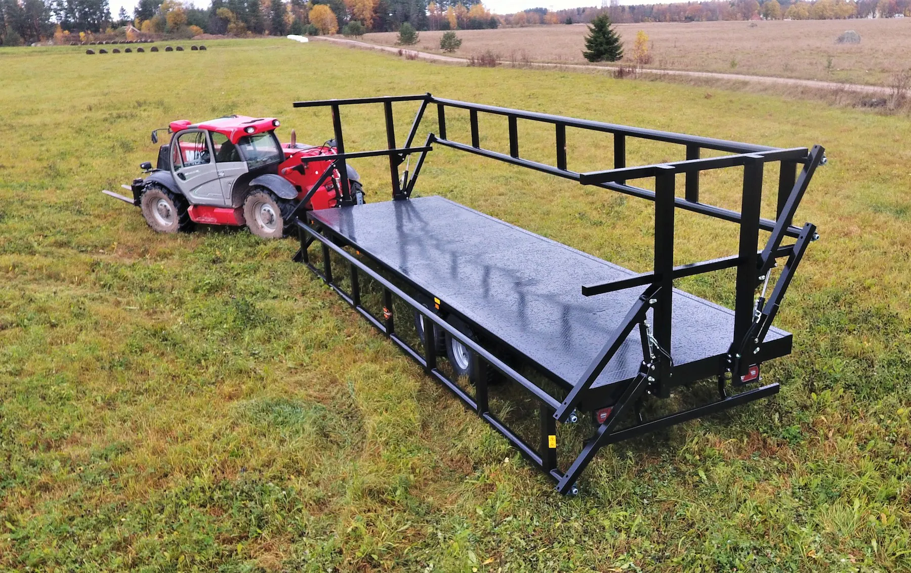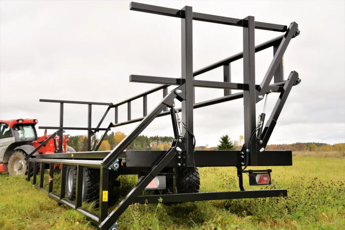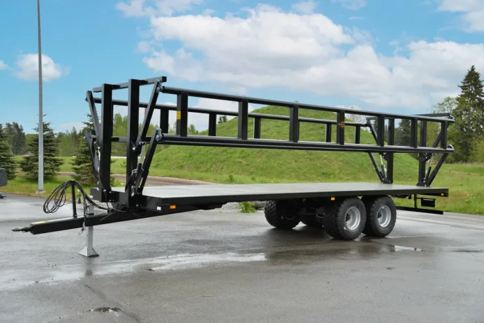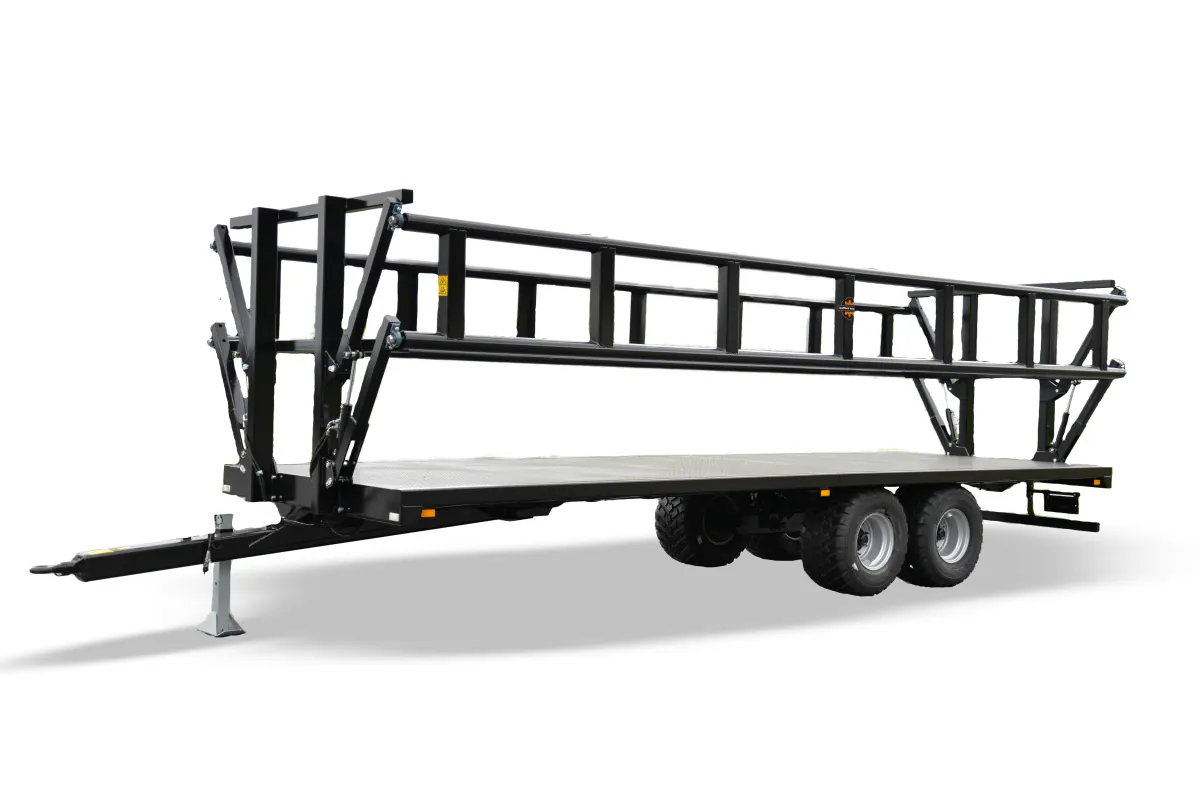 Lavettimalleina tarjoamme lastausalueeltaan 6,5–9,8 metrin perävaunuja. 7,5 metrin mallista alkaen perävaunun voi tilata myös hydraulisilla sivulaidoilla, jotka vähentävät merkittävästi kuorman kiinnittämiseen kuluvaa aikaa. Sivulaitojen hydrauliikassa on turvaventtiilit, jotka estävät laitojen putoamisen mikäli paine häviää letkuista. Turvaventtiilien käyttö mahdollistaa hydrauliletkujen kytkemisen traktoriin, vaikka järjestelmä olisi paineistettuna eli laita olisi asetettu väliasentoon. Liukkauden vähentämiseksi vaunujen pohjalevy on turkkiteräslevyä, korkeita reunoja ei ole. Täten lavavaunut soveltuvat hyvin myös kuormalavoille pakattujen tavaroiden kuljettamiseen. Paalinkuljetusvaunujen akseleiden rakenne mahdollistaa 400–700 mm leveät renkaat, jotta pellolla liikkuminen olisi sujuvaa. 2-akseliset vaunut ovat saatavilla joko tasapaino- tai jousiakseleilla ja rakenteella, jossa paino jakautuu perävaunulle ja vetoaisalle. Tällöin osa painosta siirtyy traktorin takapyörille, mikä helpottaa liikkumista myös pehmeällä maaperällä. 19 tonnin kantavuus ja pidennetyt hydrauliset sivulaidat mahdollistavat myös suurempien (Ø 1,3–1,8 m) paalien kuljettamisen.